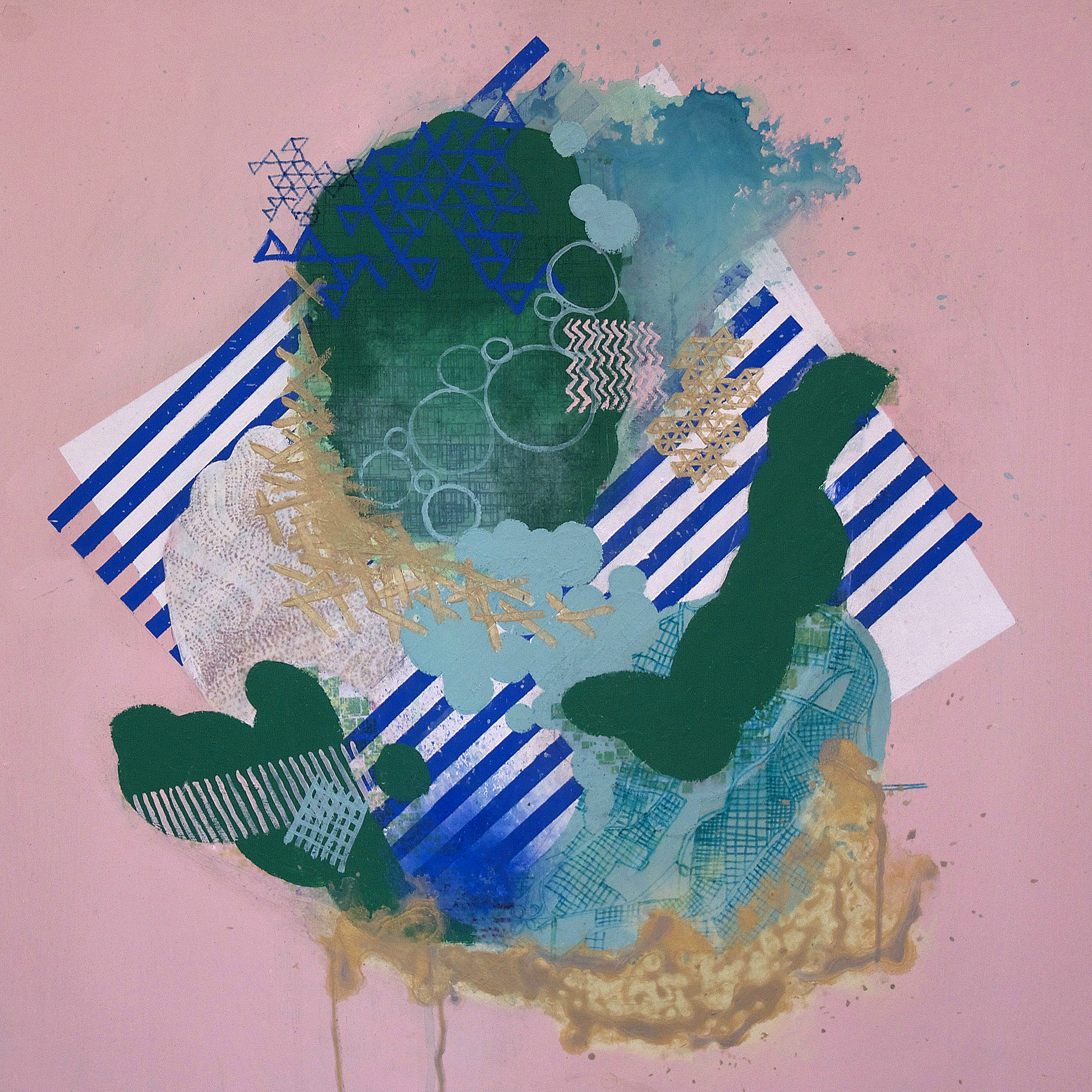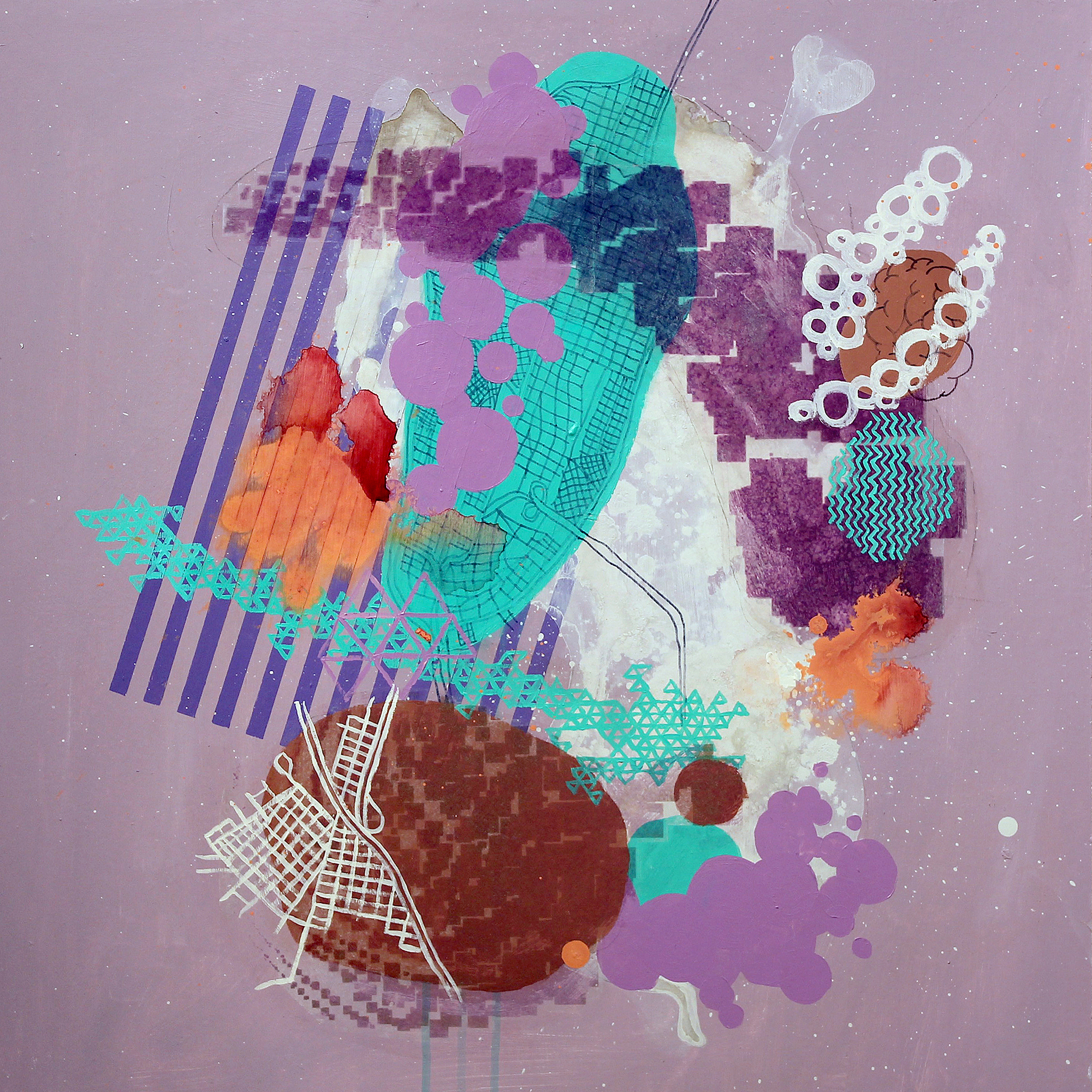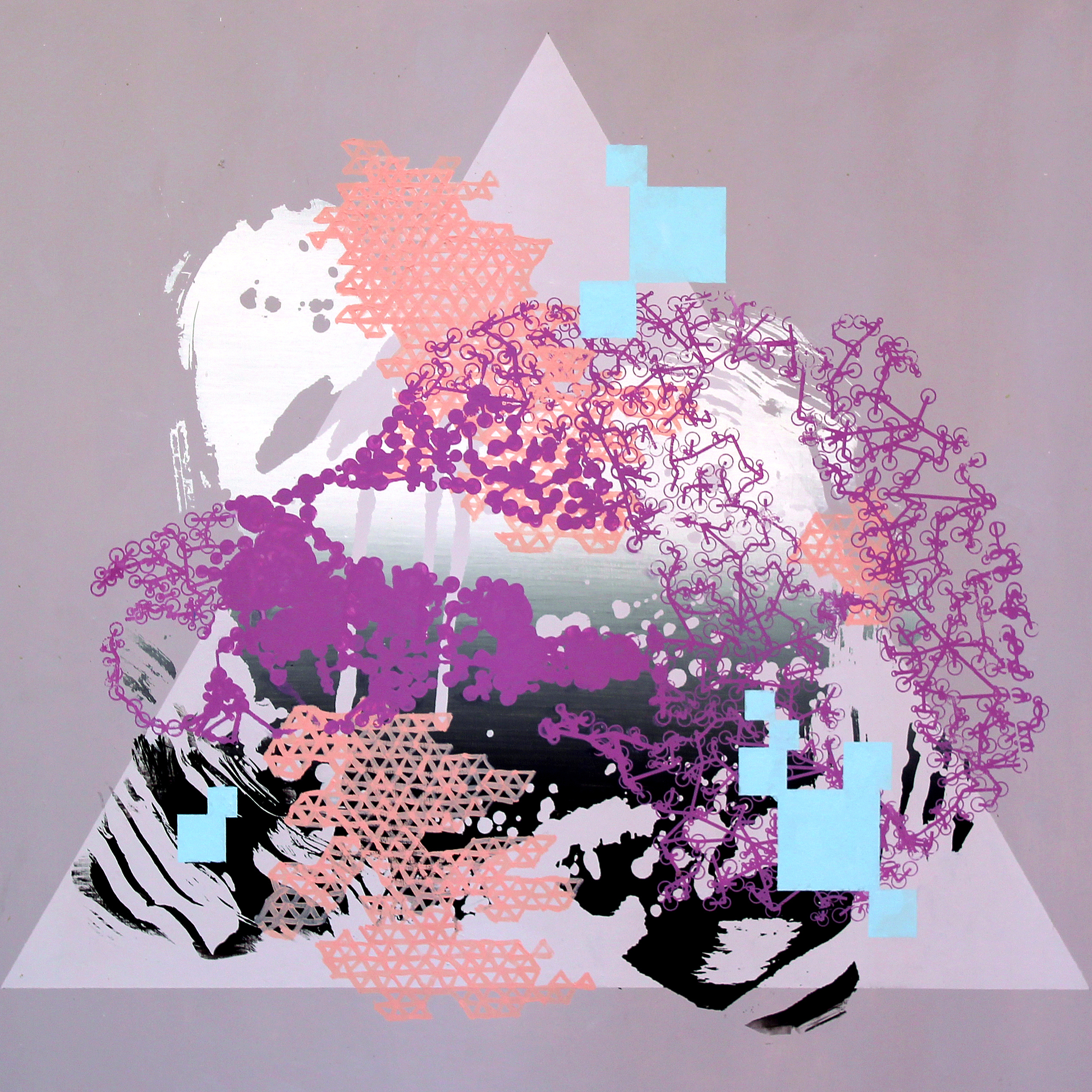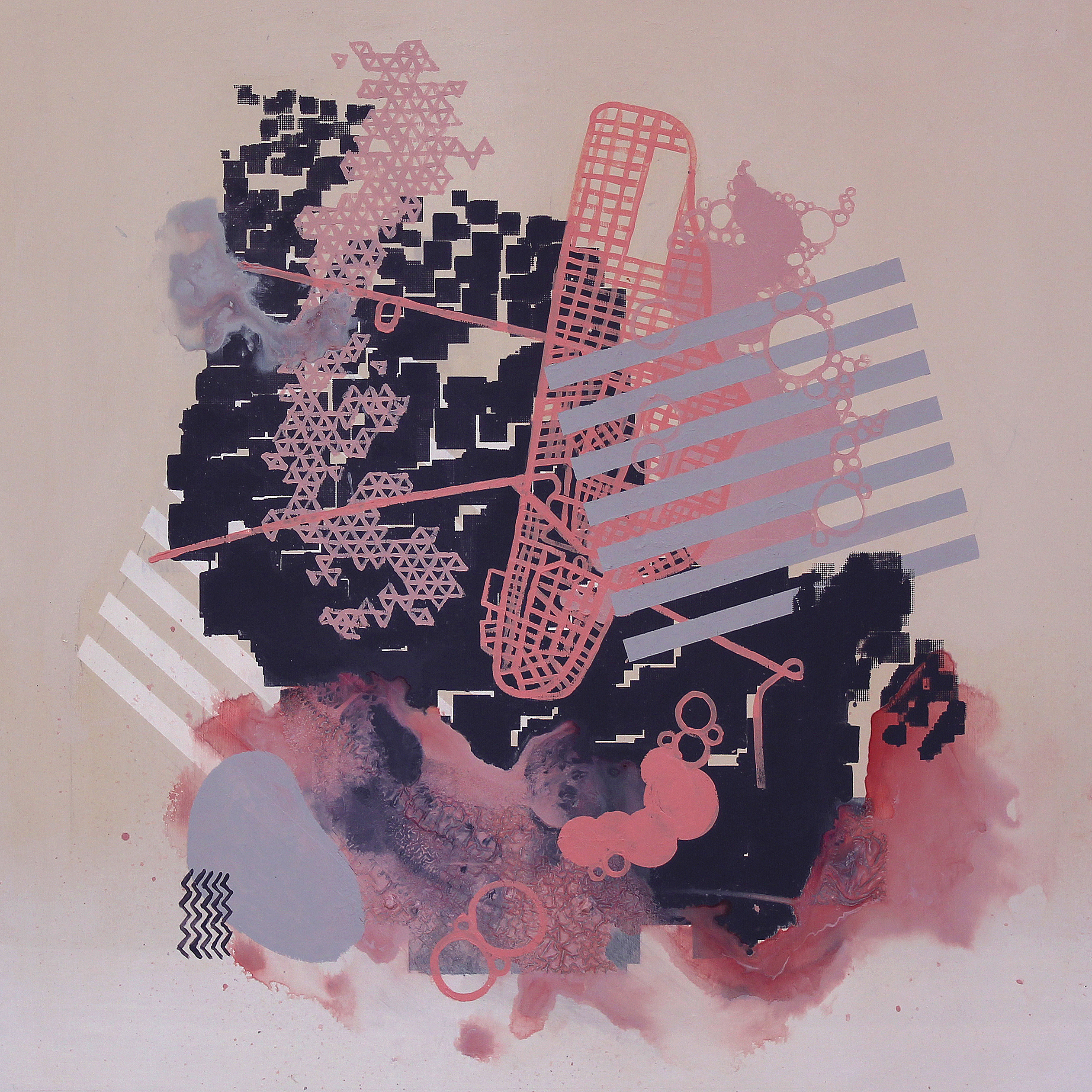 The works are a collaboration between the artist and the computer, using code to create highly complex, pixelated forms and juxtaposing them with more painterly, erratic shapes. Organic structures that resemble veins, rivers and cells are superimposed on manmade ones that mimic streets, polygons and cables. The disparate forms build upon one another to become a entirely new entity which is greater than the sum of its parts.